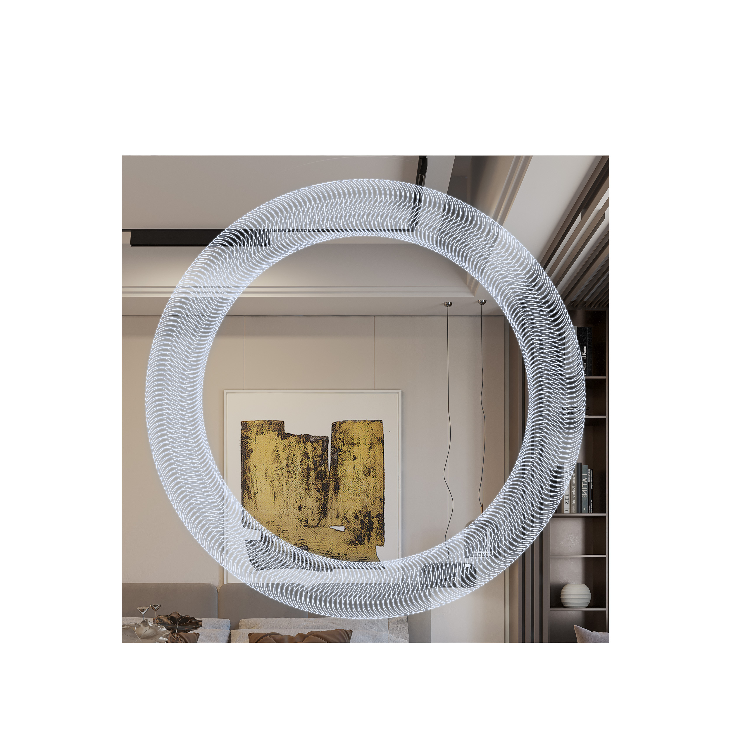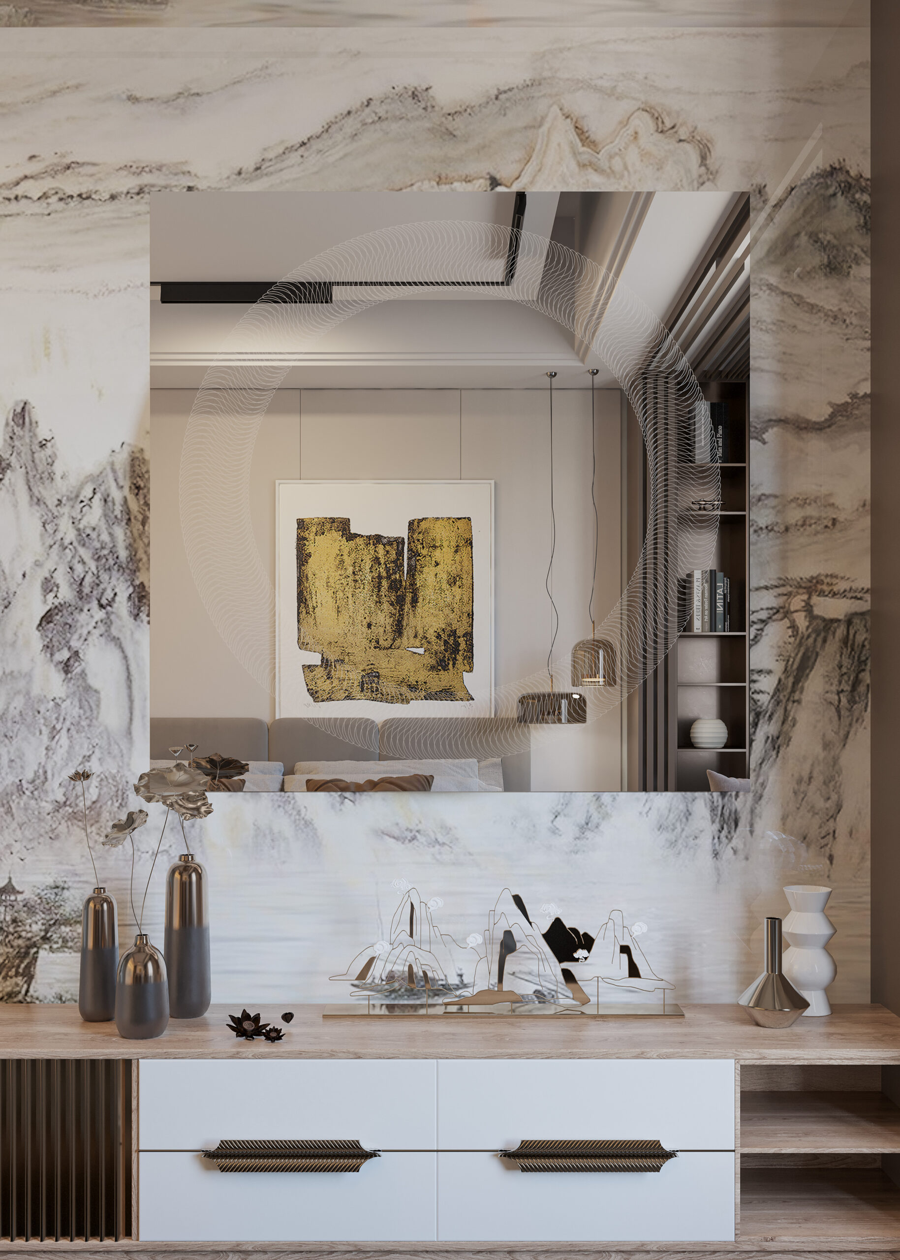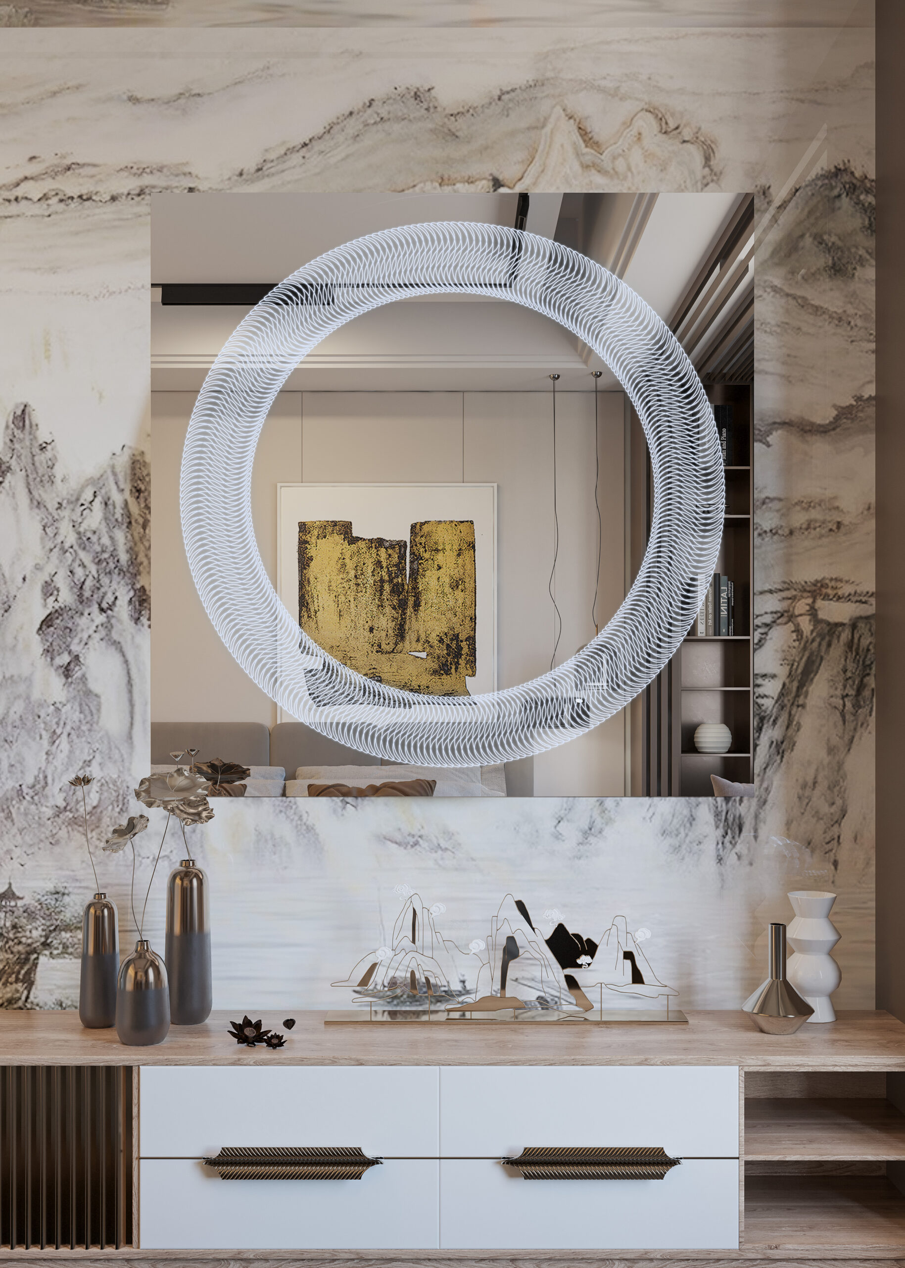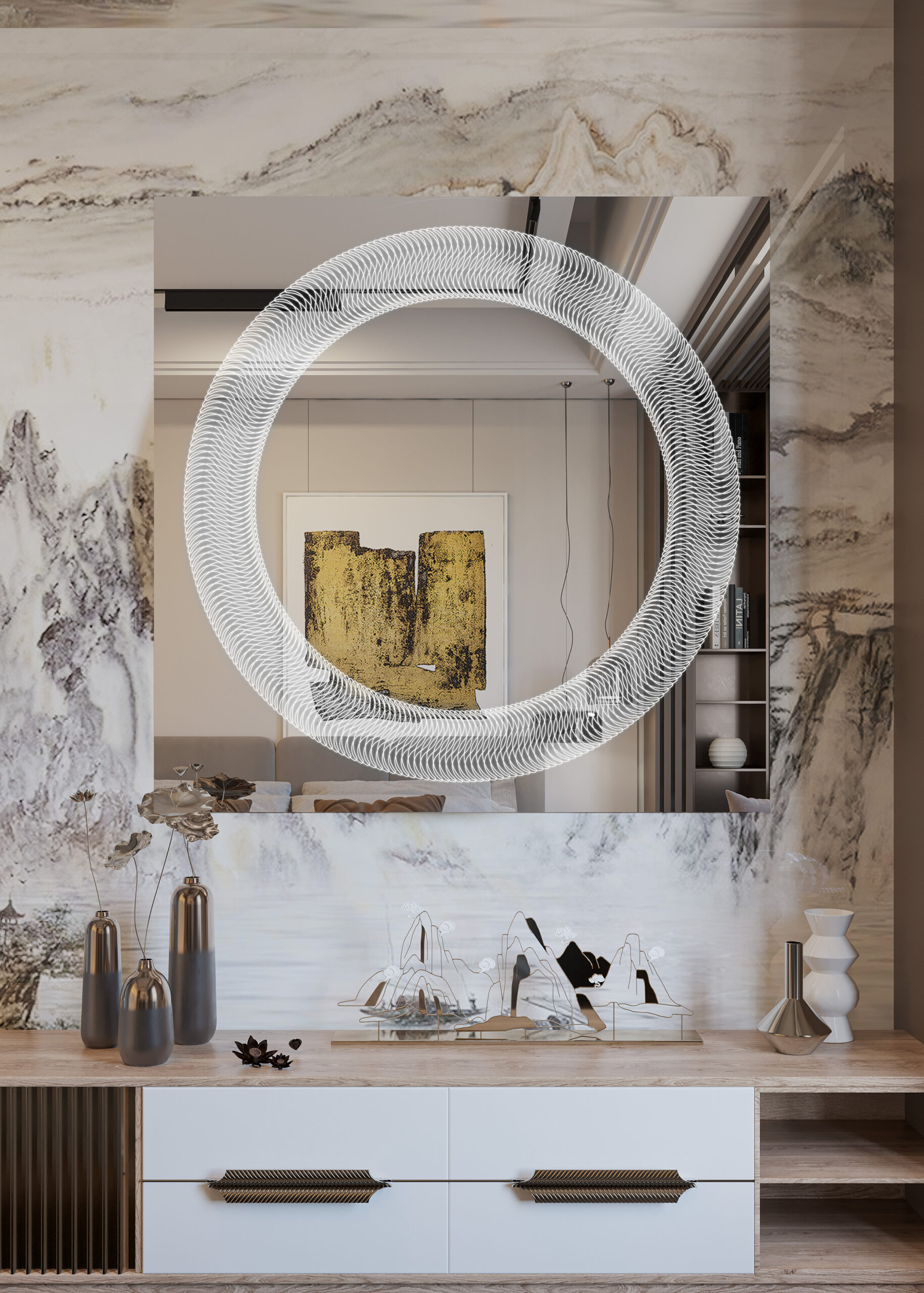 Όλα τα παραπάνω τα συνδυάσαμε με Led φωτισμό που ενεργοποιείται με αισθητήρα κίνησης ανέπαφα μόλις πλησιάσουμε το χέρι μας στο κάτω μέρος του καθρέφτη, ο οποίος διαχέεται περιμετρικά του καθρέφτη και διακριτικά μέσα από το χαραγμένο σχέδιο, δημιουργώντας έτσι ένα ανεπανάληπτο οπτικό φαινόμενο που θα εντυπωσιάσει εσάς και τους καλεσμένους σας.