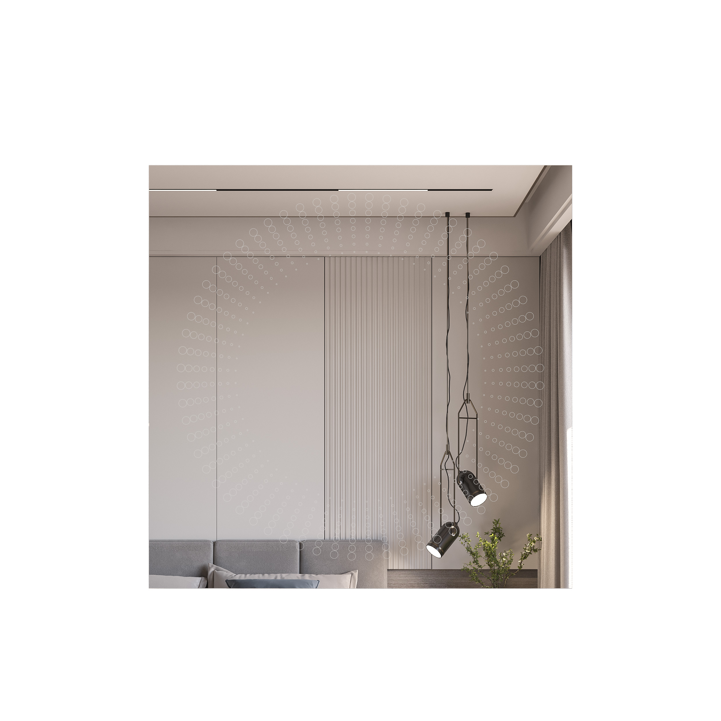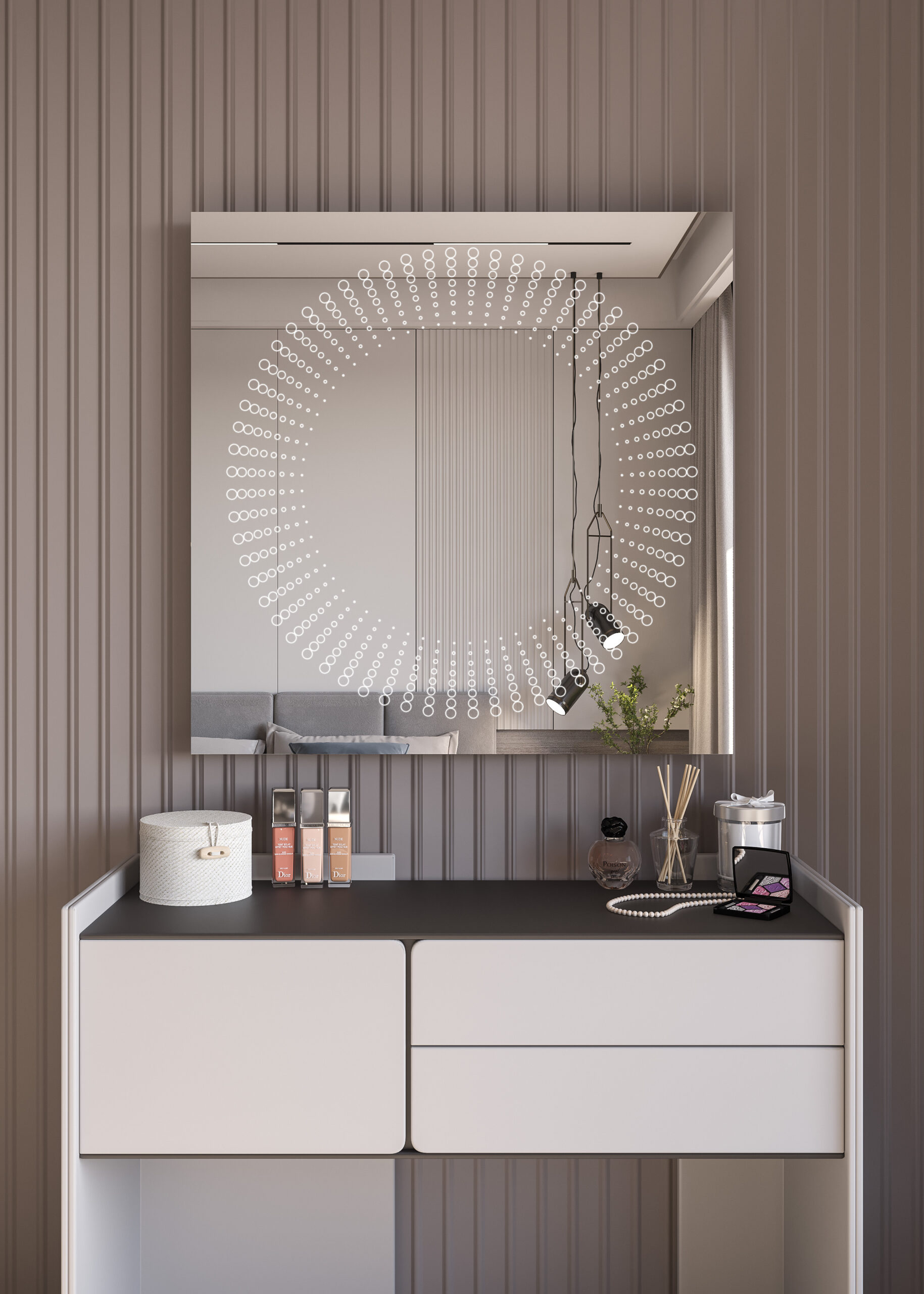 Όλα τα παραπάνω τα συνδυάσαμε με Led φωτισμό που ενεργοποιείται με αισθητήρα κίνησης ανέπαφα μόλις πλησιάσουμε το χέρι μας στο κάτω μέρος του καθρέφτη, ο οποίος διαχέεται περιμετρικά του καθρέφτη και διακριτικά μέσα από το χαραγμένο σχέδιο, δημιουργώντας έτσι ένα ανεπανάληπτο οπτικό φαινόμενο που θα εντυπωσιάσει εσάς και τους καλεσμένους σας.