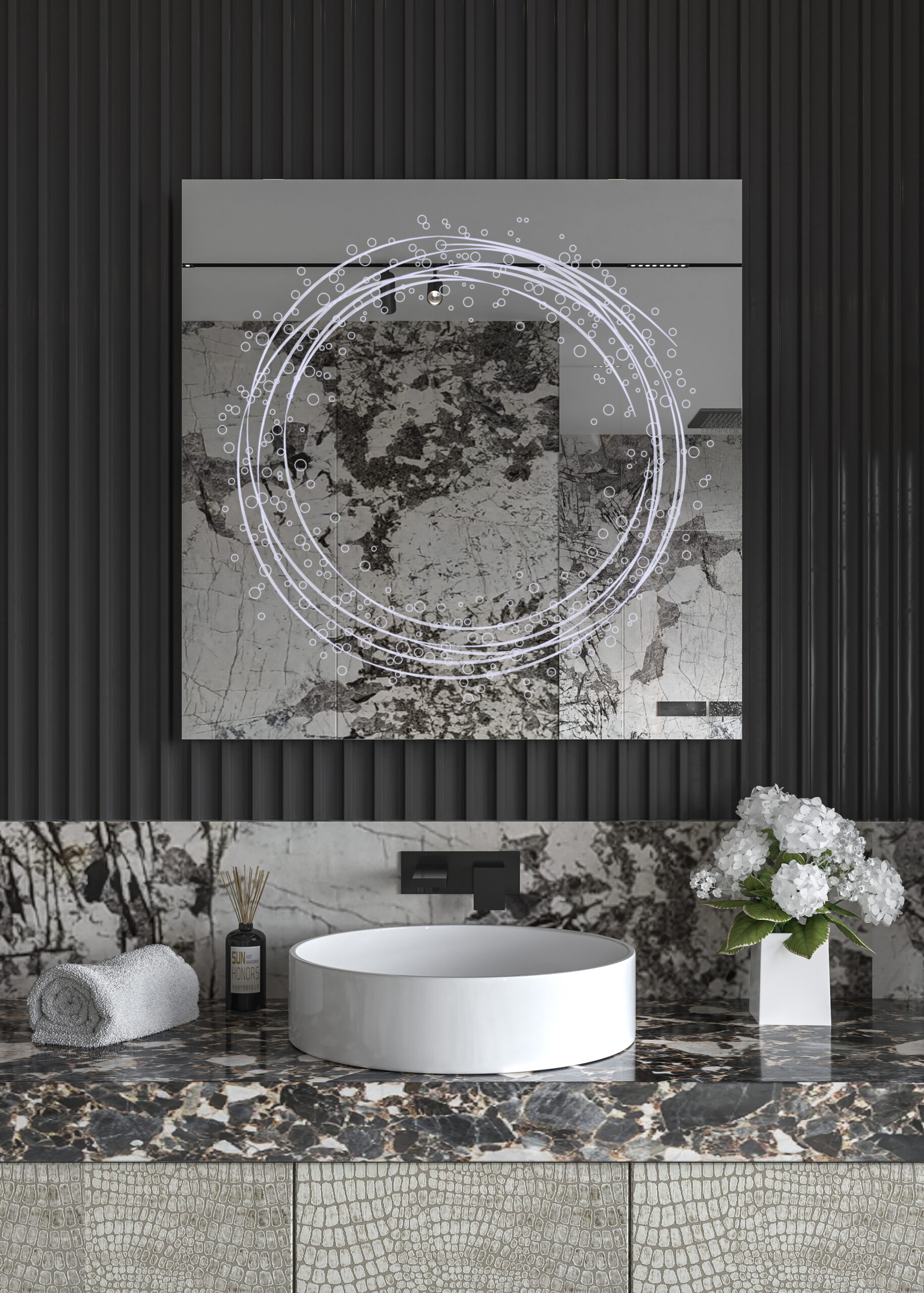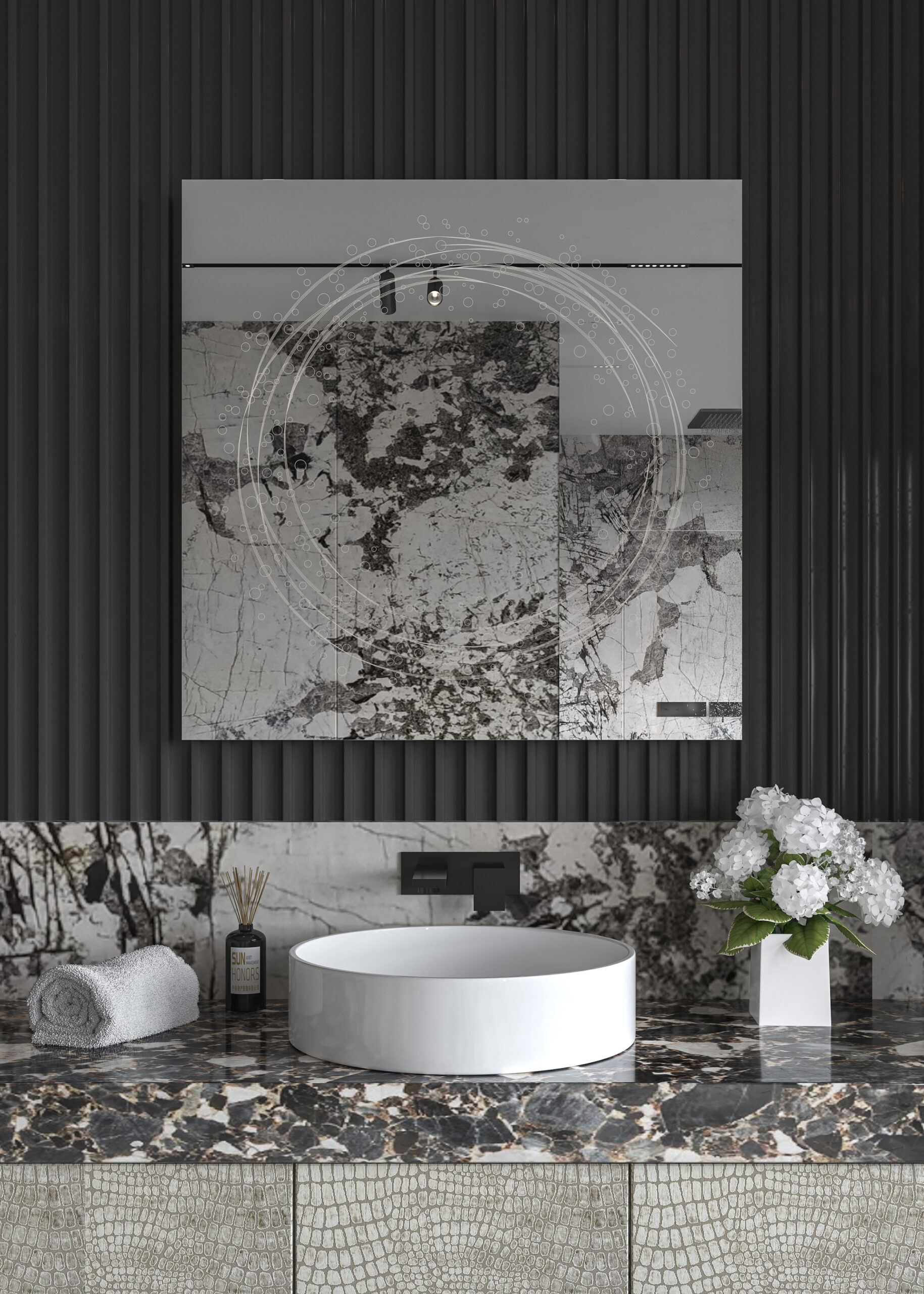Όλα τα παραπάνω τα συνδυάσαμε με Led φωτισμό που ενεργοποιείται με αισθητήρα κίνησης ανέπαφα μόλις πλησιάσουμε το χέρι μας στο κάτω μέρος του καθρέφτη, ο οποίος διαχέεται περιμετρικά του καθρέφτη και διακριτικά μέσα από το χαραγμένο σχέδιο, δημιουργώντας έτσι ένα ανεπανάληπτο οπτικό φαινόμενο που θα εντυπωσιάσει εσάς και τους καλεσμένους σας.